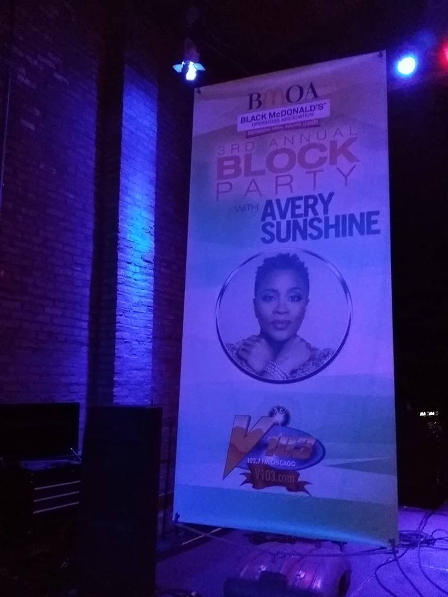 In working with BMOA – the Black McDonald’s Operators Association, I was able to attend the Block Party in Berwyn, Il at The Wire as a VIP, and I was able to bring a guest. Unfortunately Mr. Houseful still thinks the person that I went to see is like the unicorn, however, my friend Monica who introduced me to Avery Sunshine years ago, does not think I was unicorn huntin, and she agreed to accompany me. I was able to take in a mini concert with Ms. Avery Sunshine and she performed so well that I wish that I had a mama to slap! She came out on stage, and I LOVE her presence. So down to Earth, and FUNNY! The fact that she rocked gloss, long earrings, bracelets and high heeled booties with fringe just made me love her more. AND SHE HAS GLITTER ON HER ARMS! Unicorn! I’m telling you! I can’t even properly describe her voice. Smooth as velvet. Think this generations Anita Baker, mixed with more upbeat hooks. It’s too hard to narrow down, but that’s where I go.