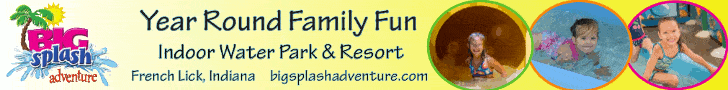 Big Splash Adventure is a 40,000 square foot indoor water park-complete with a rare retractable roof-located in French Lick Indiana, and adventure unlike any other! Big Splash has many thrilling, twisting, and exciting water slides and a whirling turbo bowl! The interactive Buccaneer Bay thrills and excites children of all ages—especially the 1000 gallon dumping bucket! The Splish Splash pool is perfect for the youngest of adventurers, and the activity center—complete with water basketball and other fun activities—is great for older kids. For adults, there is the adults only Palm Cove hot tub, and don’t forget the Lost River! The river flows lazily throughout the park.