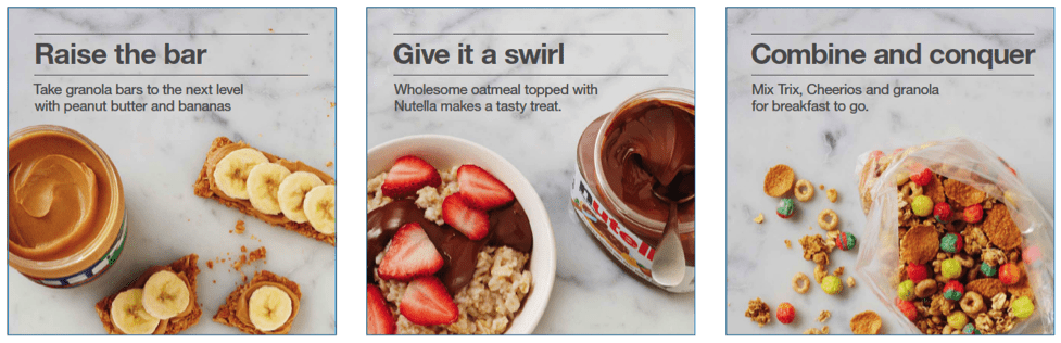 Other items you could throw in the mix would be granola, any of the Big G cereals, yogurt, some jam (can you say parfait?!) and any selection of fresh fruit you can get your hands on. You can find BUNCHES of ideas on Target