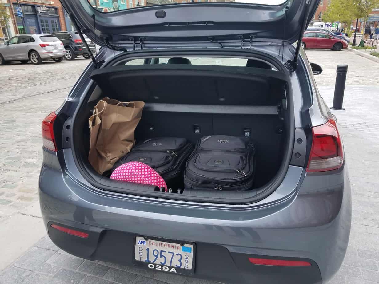 Given that the Kia Rio is a hatchback, and we really didn’t get to test the trunk space on our drive through the rolling hills of Baltimore, it was nice to see that the trunk could fit both of our carry-on size luggage plus extra goodies we picked up last minute because we realized that we were driving back home!
