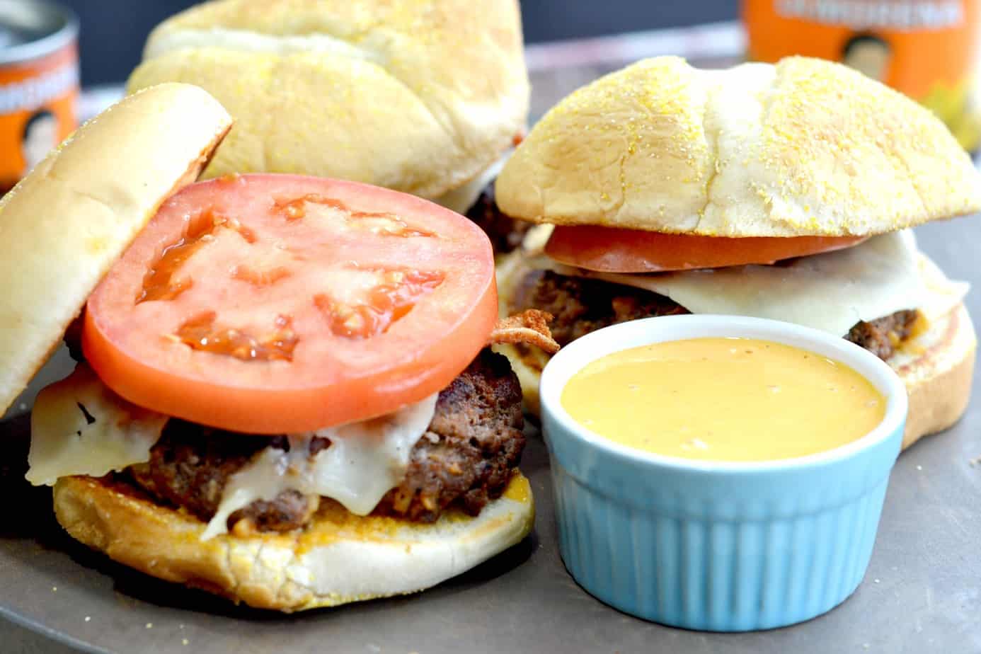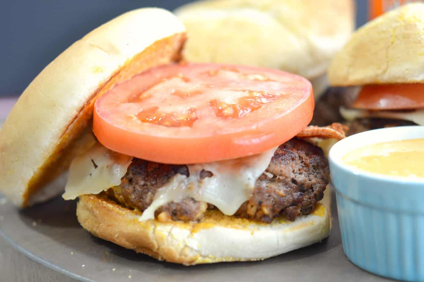 The burgers are so juicy, and so darn GOOD! Just to make you all salivate even more, I added some chipotle aioli sauce to the mix, and it’s PERFECT for dipping, or spreading on toasty bread that’s going to nestle a great big burger and a thick slice of tomato with cheesy goodness. Y’all, these are so good! They are good enough and BIG enough to keep even the hungriest fotball fan satisfied so that they can focus on the big game, and they are super simple so you can enjoy as well. Topping them off with the chipotle aioli really sealed the deal. Using a French condiment with a chipotle flavor turned this into a fully Latin flavored fusion, and something that we will make over an over again.