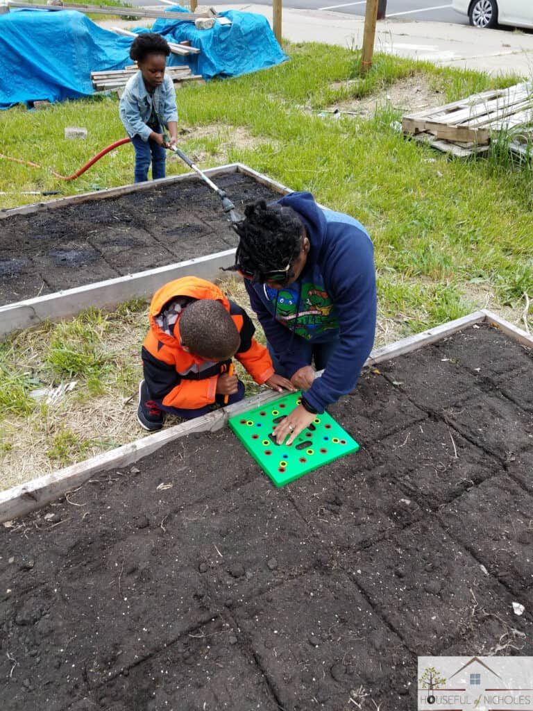 Hey all! I’m back with some garden goodies for you! I was sent the Seeding Square for the Community Garden, and I LOVE IT! I did tell Shomari last year that I wanted something that would make it easier to plant in the garden without having to eye it. Even though eyeing it didn’t do so badly last year, it’s just nice to have something in our toolbox to make sure that we’re doing things properly, and in order. It’s also great to have for those folks who may come and help us plant that don’t really have the ability to eye it. Do you know what I mean?