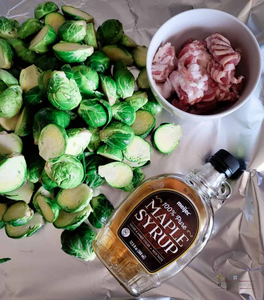 Anyway, this Brussels sprouts recipe uses four ingredients – Brussels sprouts, thick cut bacon, maple syrup, and olive oil. We also use S&P but those are freebies, so we’re not counting them for you numbers purists.
