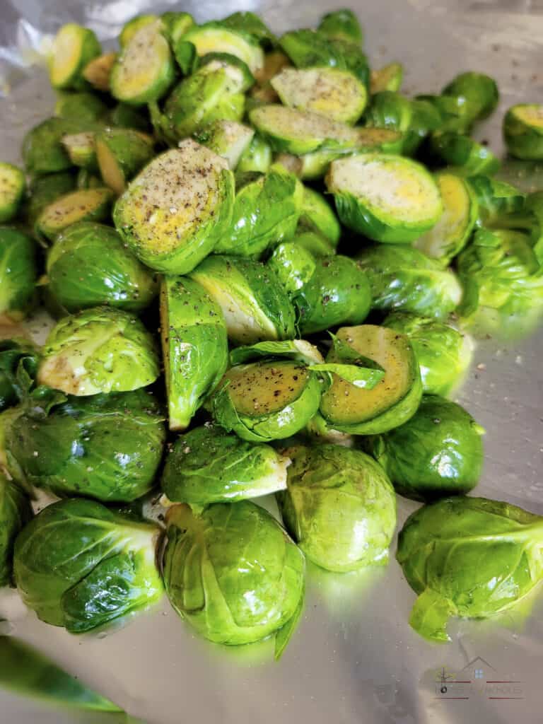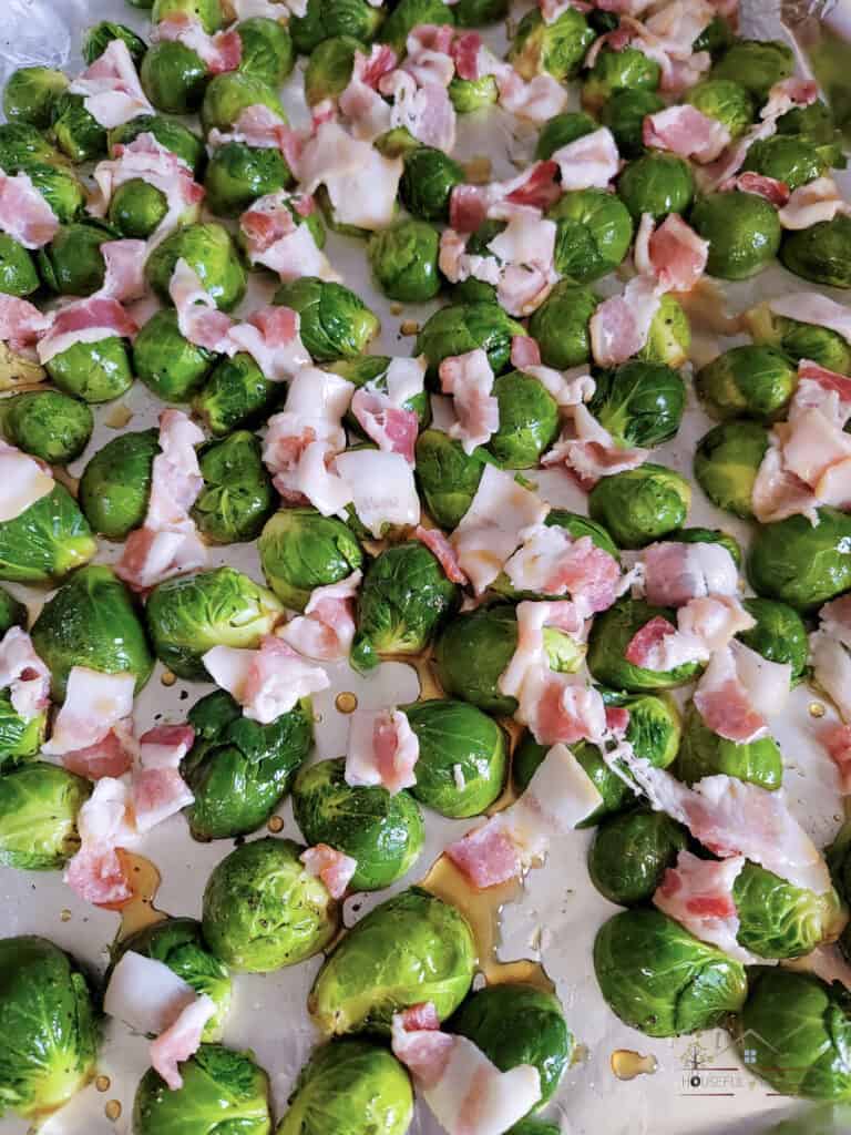 - Line a roasting pan with aluminum foil and dump your sprouts and bacon in the middle.
