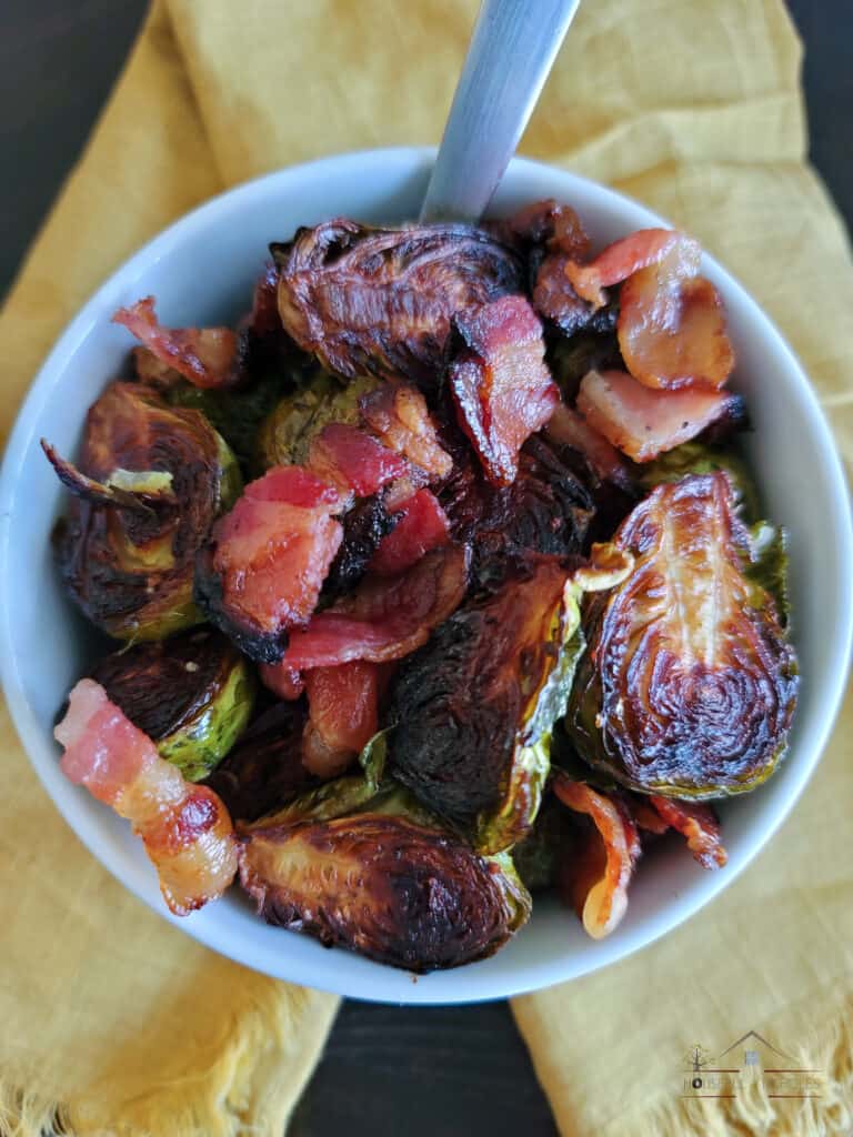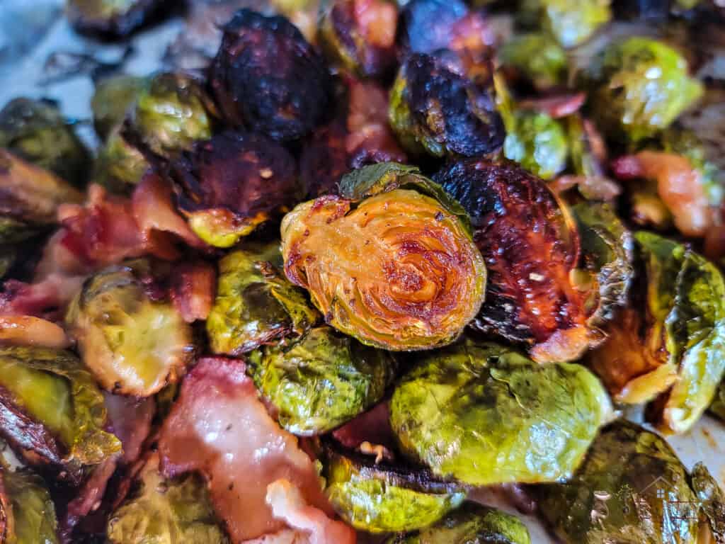 - Lay the Brussels sprouts flat side down and roast for 25-30 minutes OR until the outer leaves are crispy, and the flat side is a caramel color. The bacon should also be crispy.