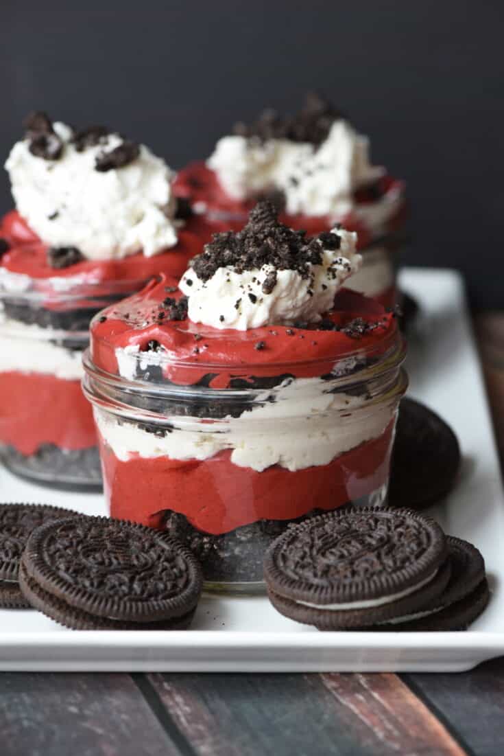 Start in a wide mason jar and build in order - cookie crumbs, cheesecake filling, whipped topping, cookie crumbs, cheesecake filling, and whipped topping. Finish with whipped cream and cookie crumble garnish and refrigerate for 30 minutes.