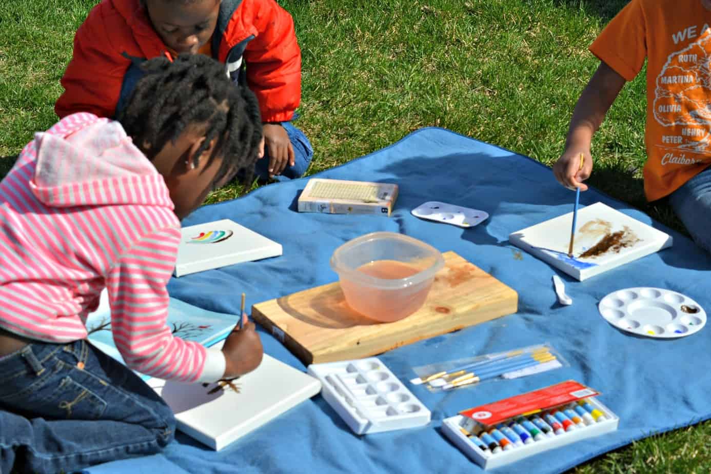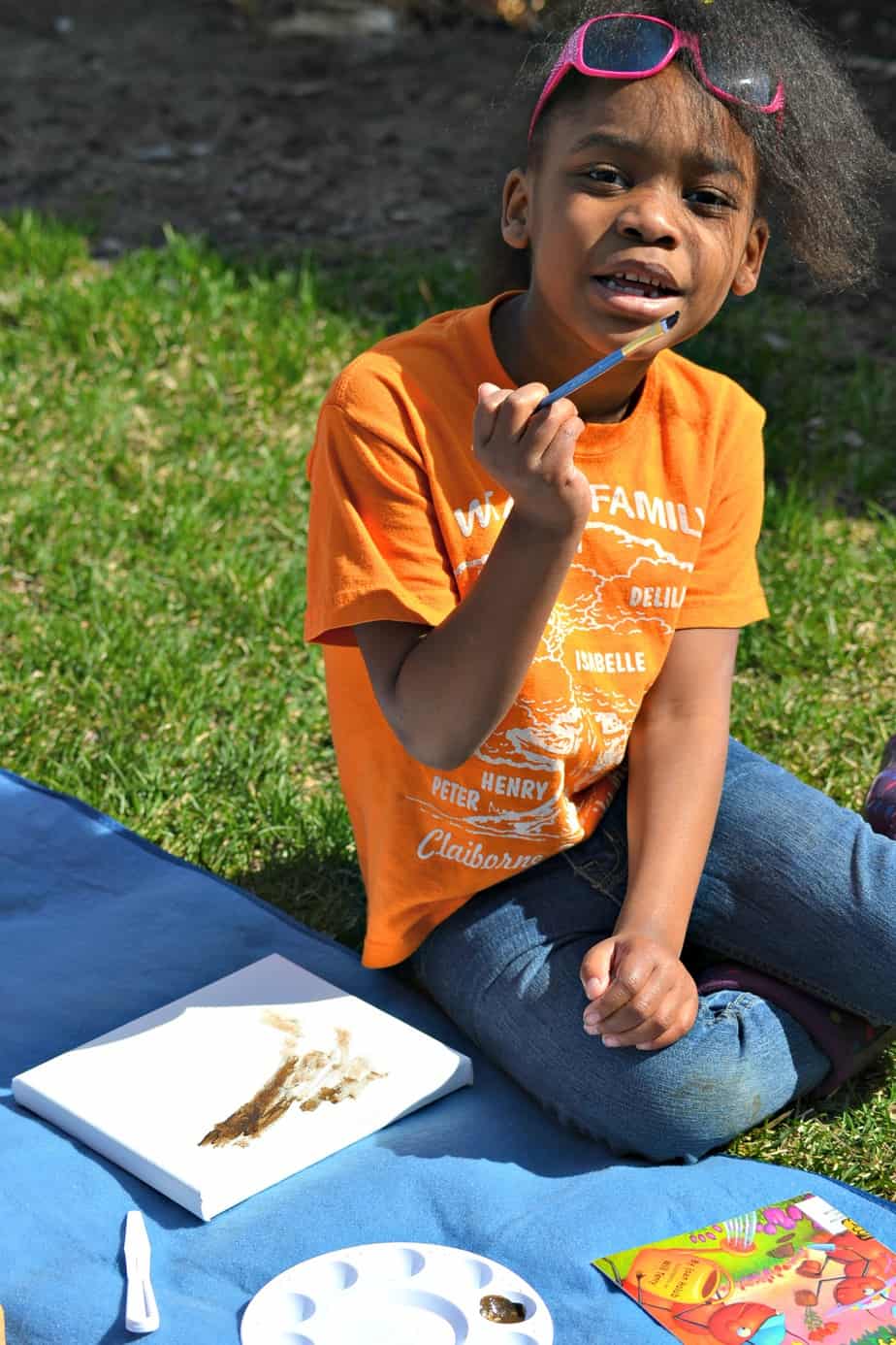 Being blessed enough with a couple of warm days before being hit with sickness over this way, we were able to go outside to our backyard (still one of the greatest things to come from building with Habitat for Humanity) and paint some scenes from a couple of our spring themed books. We love walking to our neighborhood library to pick up books and bring them back home to dive into them. Each of the littles picked the book that they loved the most, and chose a scene from it to replicate on canvas.