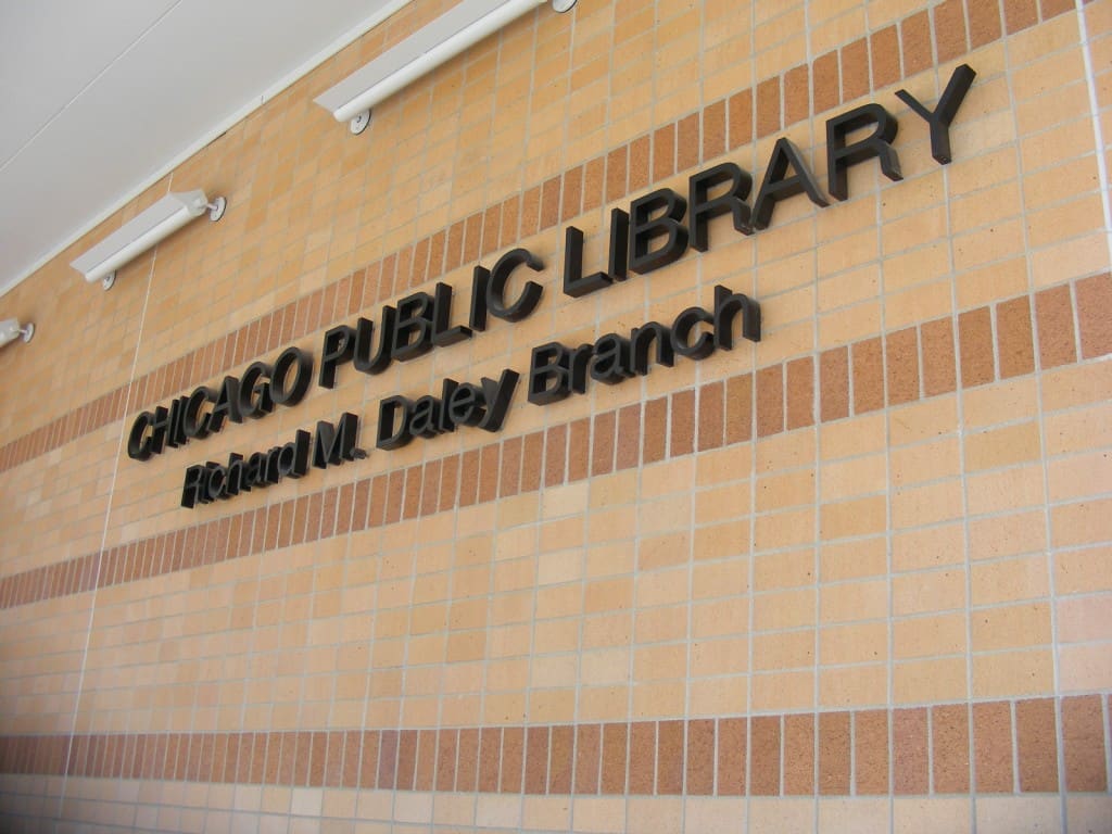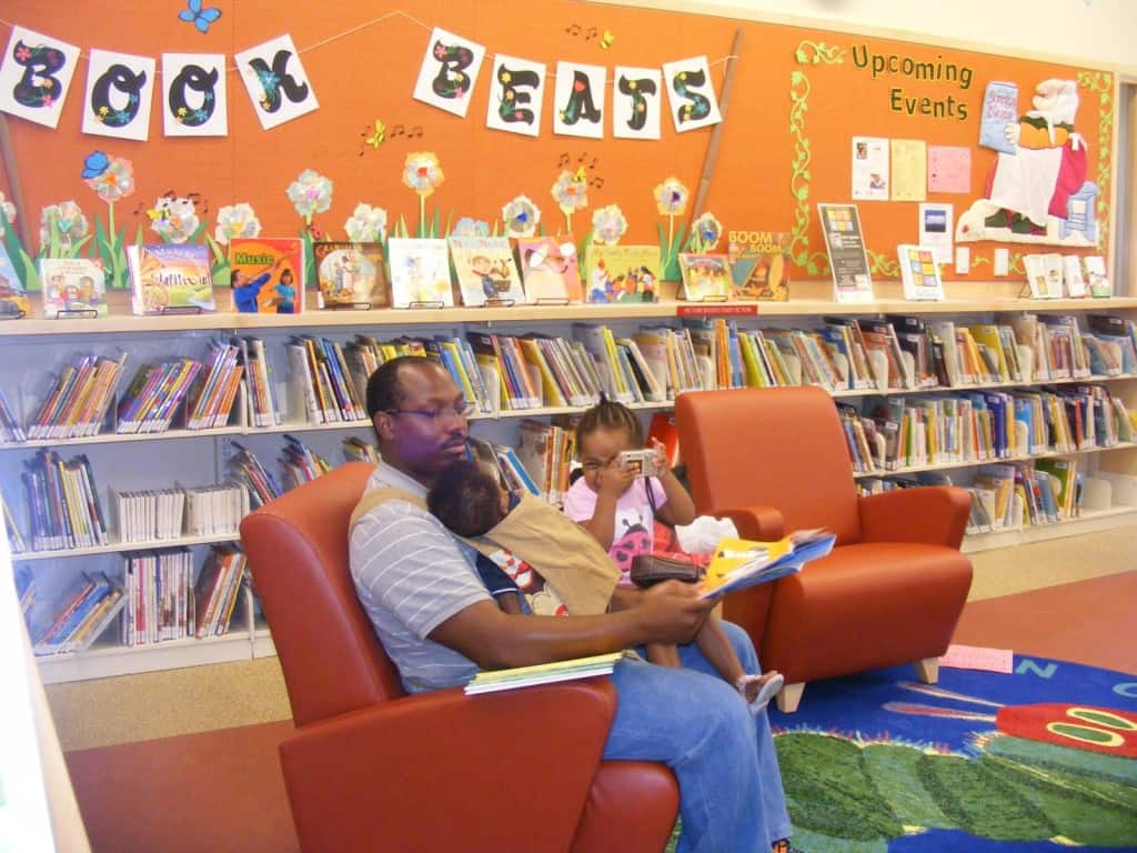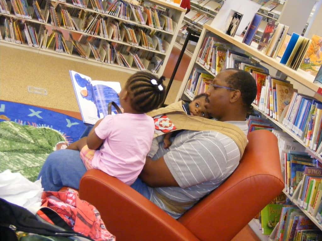 Today like most Tuesdays, the Houseful gathered up and went on our way to the library. Except today was a little different. In our neighborhood they opened up a brand new library. The Richard M. Daley branch of the Chicago Public Library system. It’s awesome sauce (I got that from the ladybug who got it from I have NO idea.) There is something magical about being one of the first to enter a new building, let alone a brand new library. I was able to grab some action shots of Papa Nicholes reading to Sir Twizzler and the Ladybug, but no more because I was a bit scared that the patrons would think that I was slightly crazy.