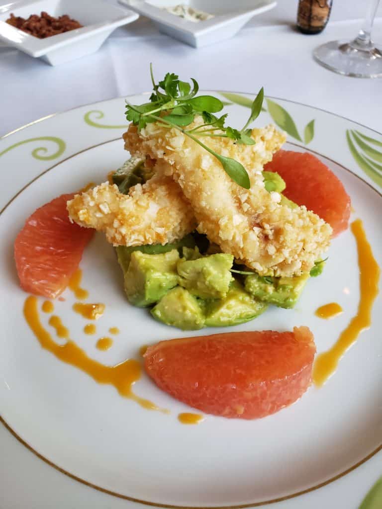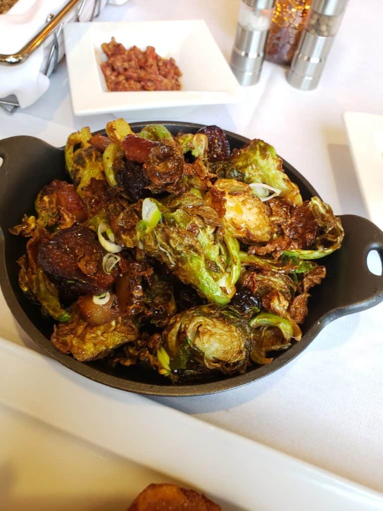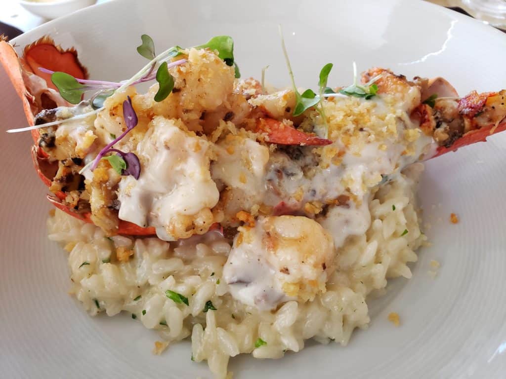 Rice Cracker Crusted Lobster Charred Shrimp & Asparagus Brussels Sprouts with Fig & Pork Belly Delmonico Oscar Cheesecake