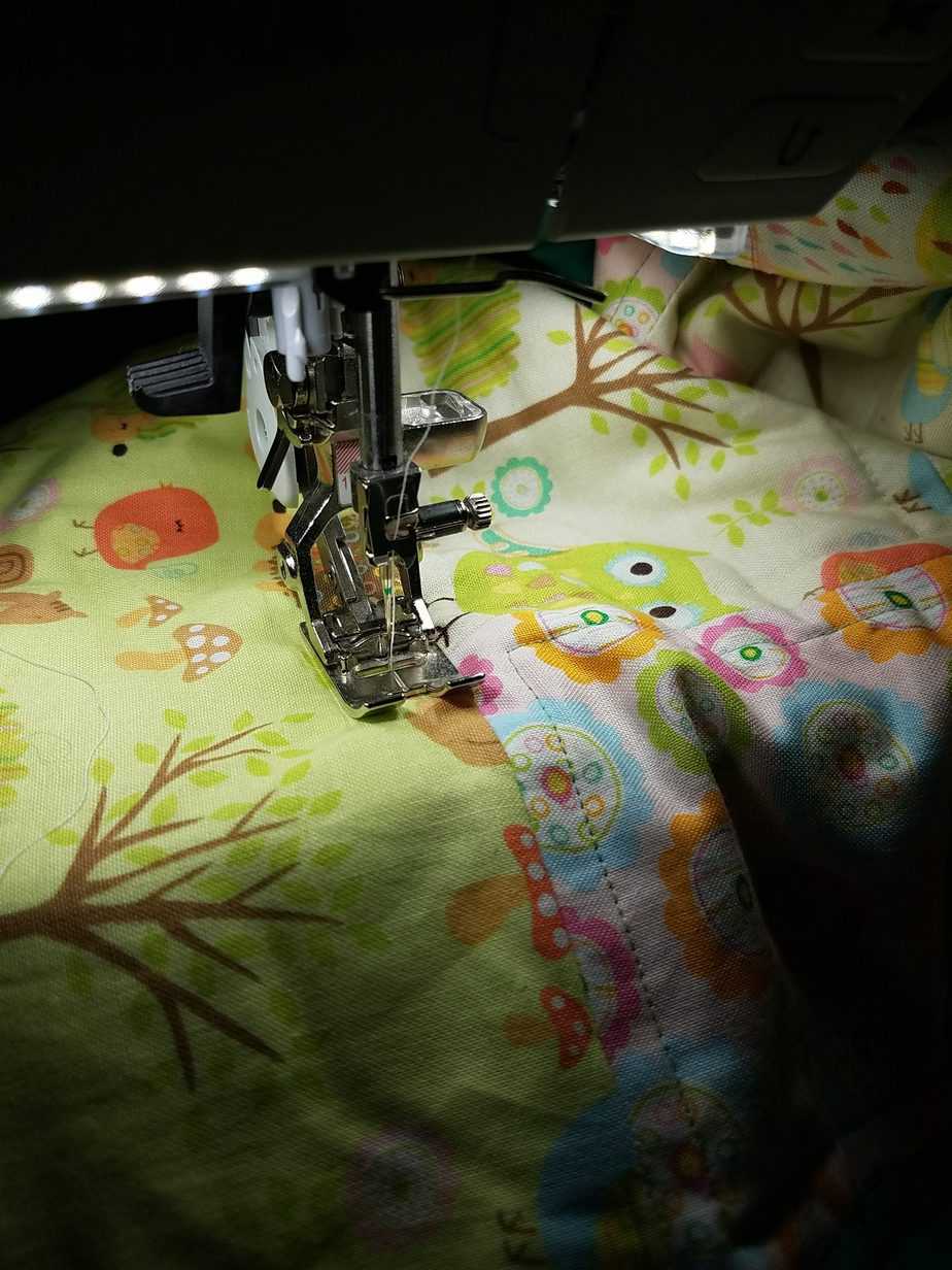 My first LARGE project was completed on the machine, and that was a quilt for Lil’ Miss. She doesn’t know it’s for her, because I was supposed to be done with it LAST YEAR. Better late than never though, right? It’s the Darcey Quilt made from Riley Blake’s Owl & Co. I started this project in October of last year, and finished the entire top and started quilting it, but became frustrated with the lack of harp space on my machine, and the fact that needles kept breaking on my plate.