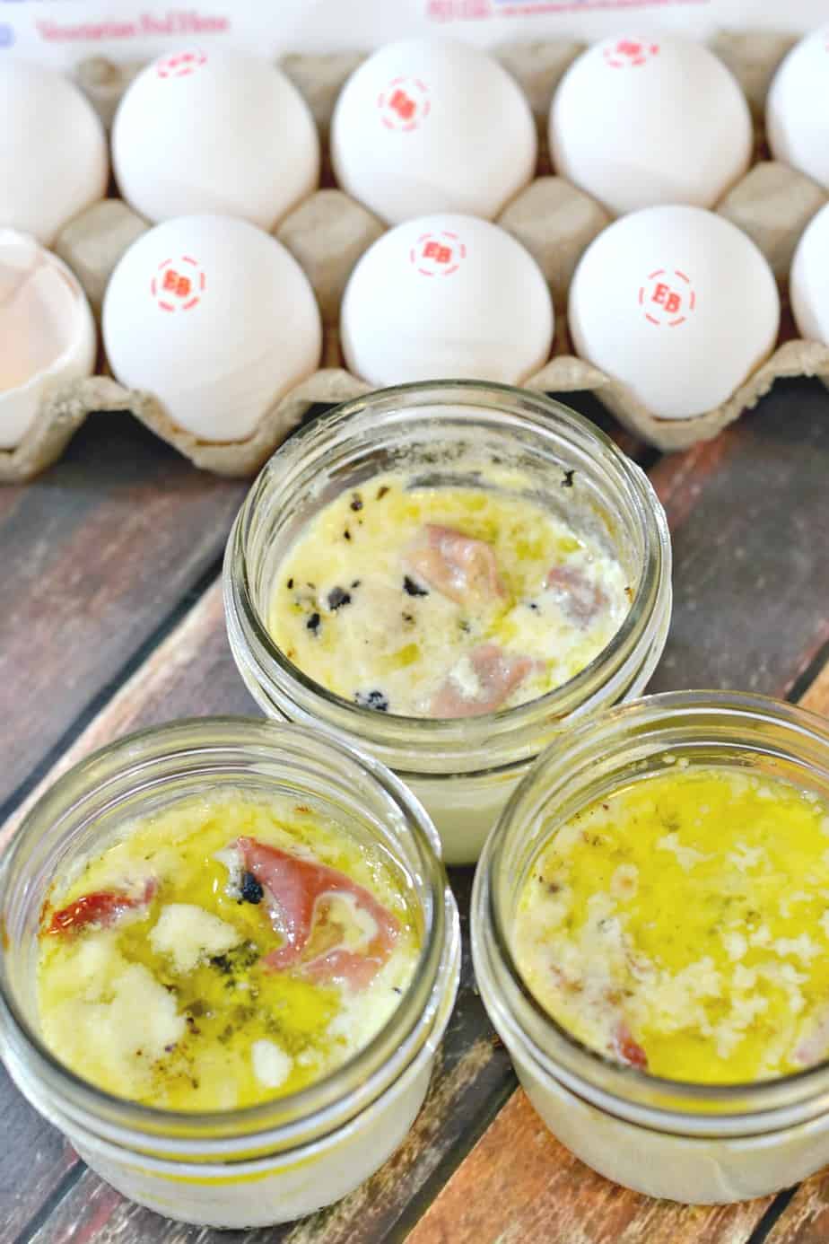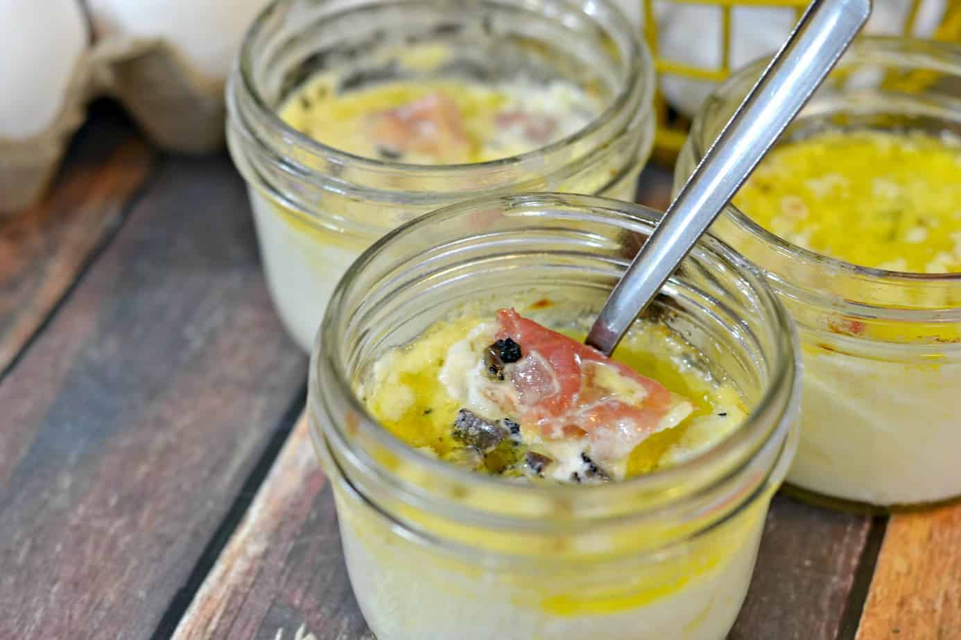 In order to make this, you can use oven save mason jars, or ramekins. You’ll need to butter all three mason jars well, so that they will bake and sizzle the eggs just right. After oiling the mason jars, you need to add two tablespoons of heavy cream, and 1 tablespoon of creme fraiche. Crack an egg into each mason jar, top with chopped truffles, a drizzle of truffle oil, and chopped prosciutto, bake for 12 minutes at 400 degrees in a water bath, and you have yourself a breakfast, lunch or dinner entree fit for royalty. Season to taste with salt and pepper, and you’re set! I would serve these up with toasted breadsticks for dipping and be in heaven.