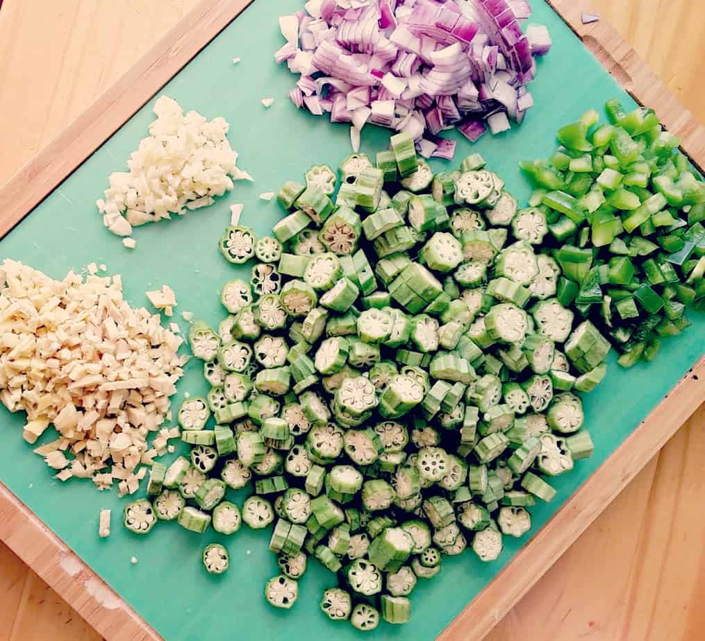 I had Lil Miss help me chop the okra, but I don’t have photos, because I had to keep an eye on her with the pairing knife. She was so excited to be cutting in the kitchen with me, and it lets me know that kids are often ready for a lot of things before we are. She did exceptionally well, and always kept her non-cutting fingers folded under while firmly holding the okra.
