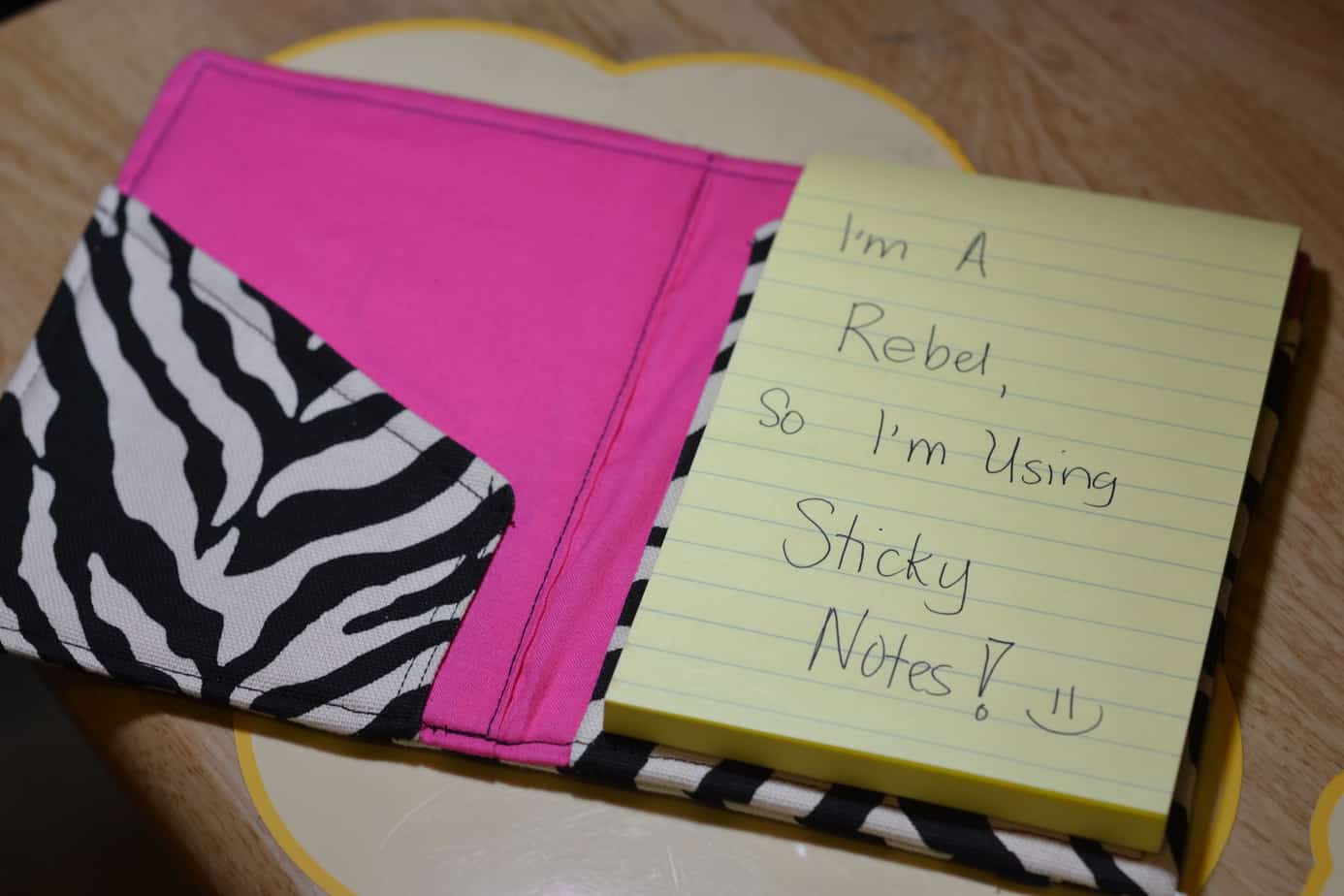 For my notepad organizers, I chose a zebra print upholstery fabric with a hot pink lining, since I was already on a roll with that combo. I also snagged black elastic because I couldn’t find zebra print, or hot pink elastic anywhere. I think the next time I make these, oh yes, there will be a next time, I’ll take her suggestion and get some hair elastic bands and cut those to match. These would be great to put into goodie bags for a birthday party full of 5 year olds who just HAVE to have something to write on at all times.